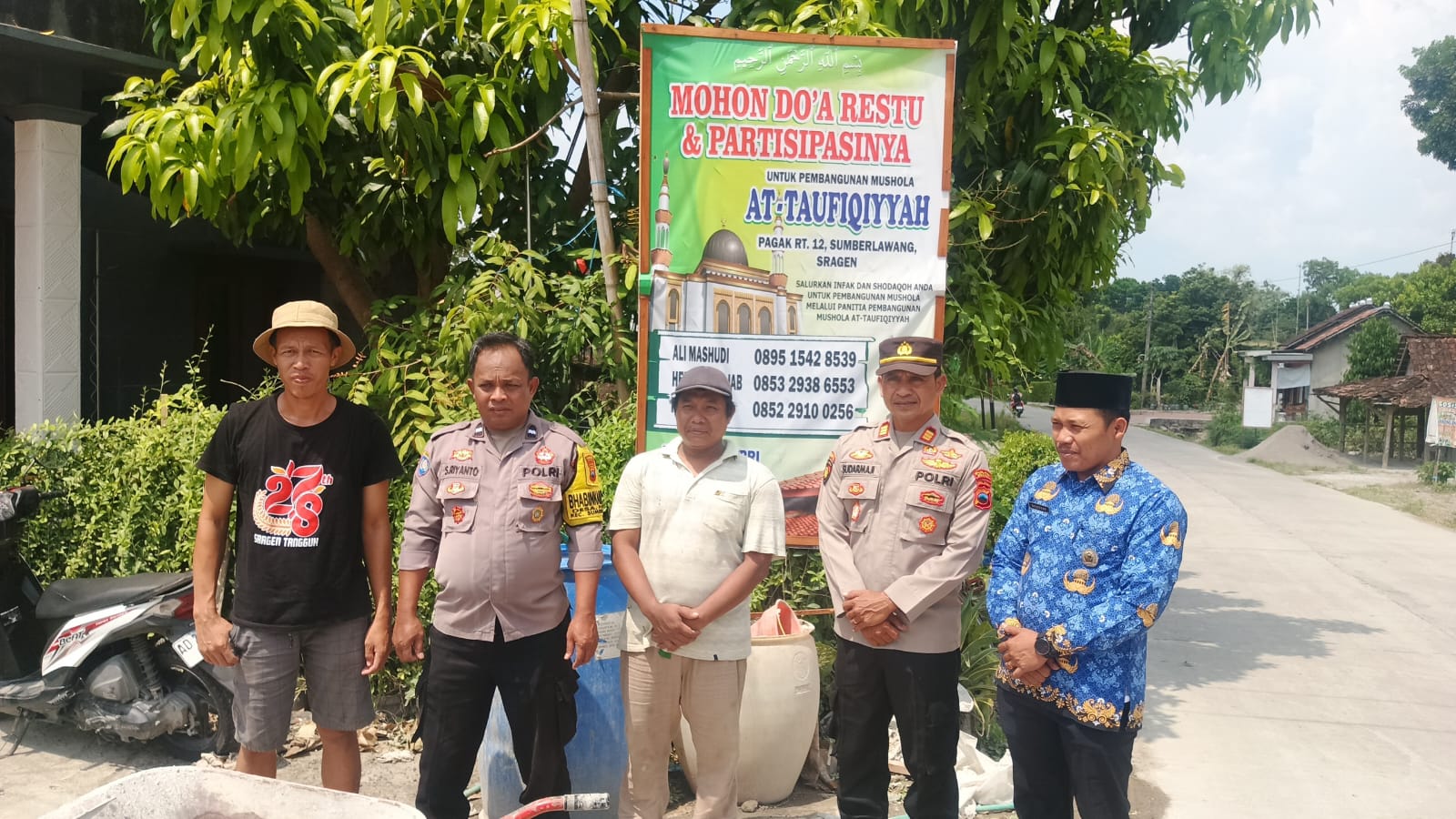 Pada Rabu (17/9/2025), Kapolsek Sumberlawang AKP Sudarmaji, memimpin langsung kegiatan silaturahmi bersama tokoh agama dan tokoh masyarakat Desa Pagak sekaligus menyerahkan bantuan material berupa 20 sak semen dan 2 rit tanah uruk untuk pembangunan Mushola Al Taufiqiyyah di Dukuh Pagak RT 12, Desa Pagak, Kecamatan Sumberlawang, Kabupaten Sragen.