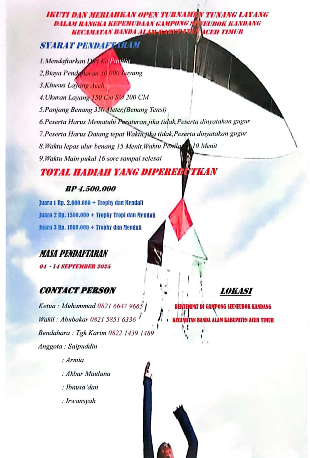Pendaftaran open perlombaan tunang layang ini di buka mulai tanggal 04 sampai 14 September 2025.