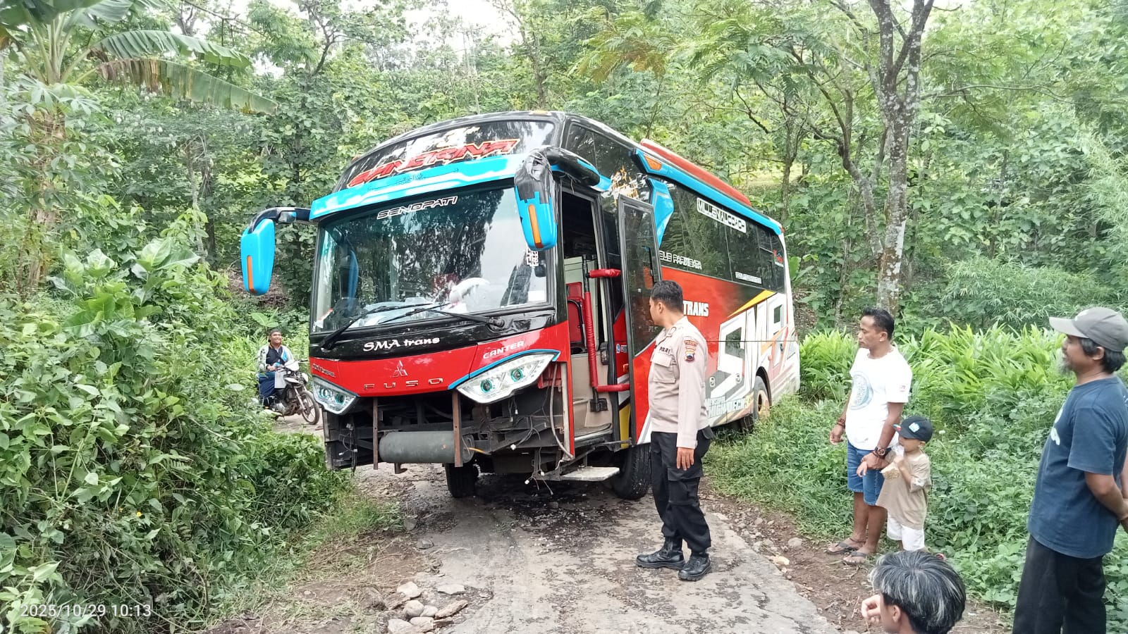 Ia menjelaskan, kondisi medan di sekitar lokasi memang tidak layak dilalui kendaraan besar. “Jalannya sempit, menanjak, dan di beberapa titik permukaannya licin karena hujan. Untuk kendaraan kecil masih bisa lewat, tapi bus ukuran besar jelas berisiko,” terang AKP Lilik Supardi.