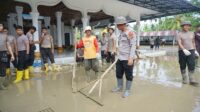Polres Lhokseumawe dan BKO Brimobda Kaltim Gotong Royong Bersihkan Masjid Syuhada Pascabanjir di Aceh Utara