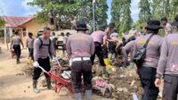 Polres Lhokseumawe Bersama BKO Brimob Kaltim Bersihkan Puskesmas Babah Buloh Pasca Banjir