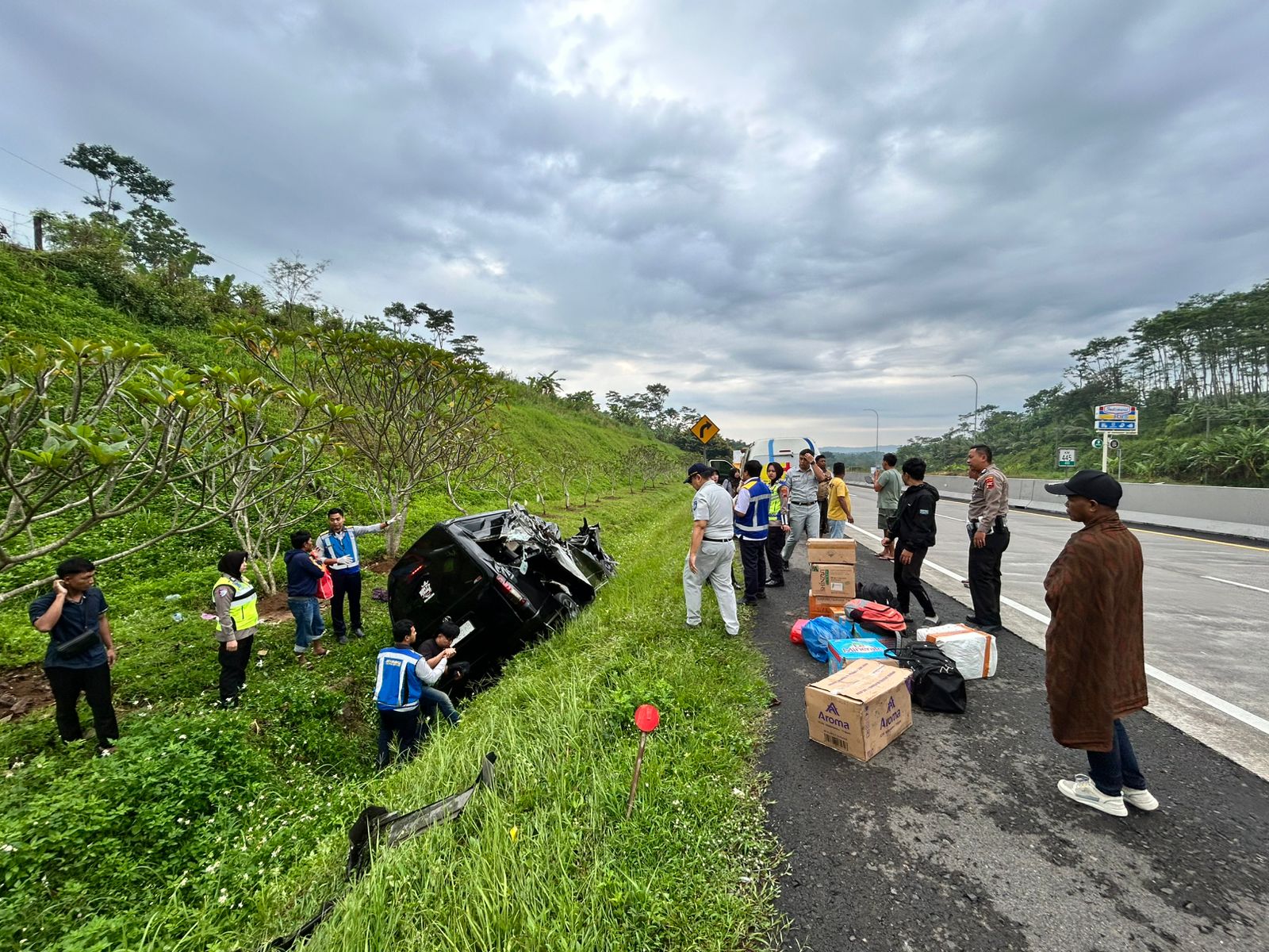 “Toyota Hiace menabrak truk B 8919 AUG bermuatan tepung yang berjalan searah dan berada di lajur lambat atau kiri, diduga sopir Hiace mengantuk menabrak bagian belakang truk dan masuk ke parit Tol.” Tambahnya.