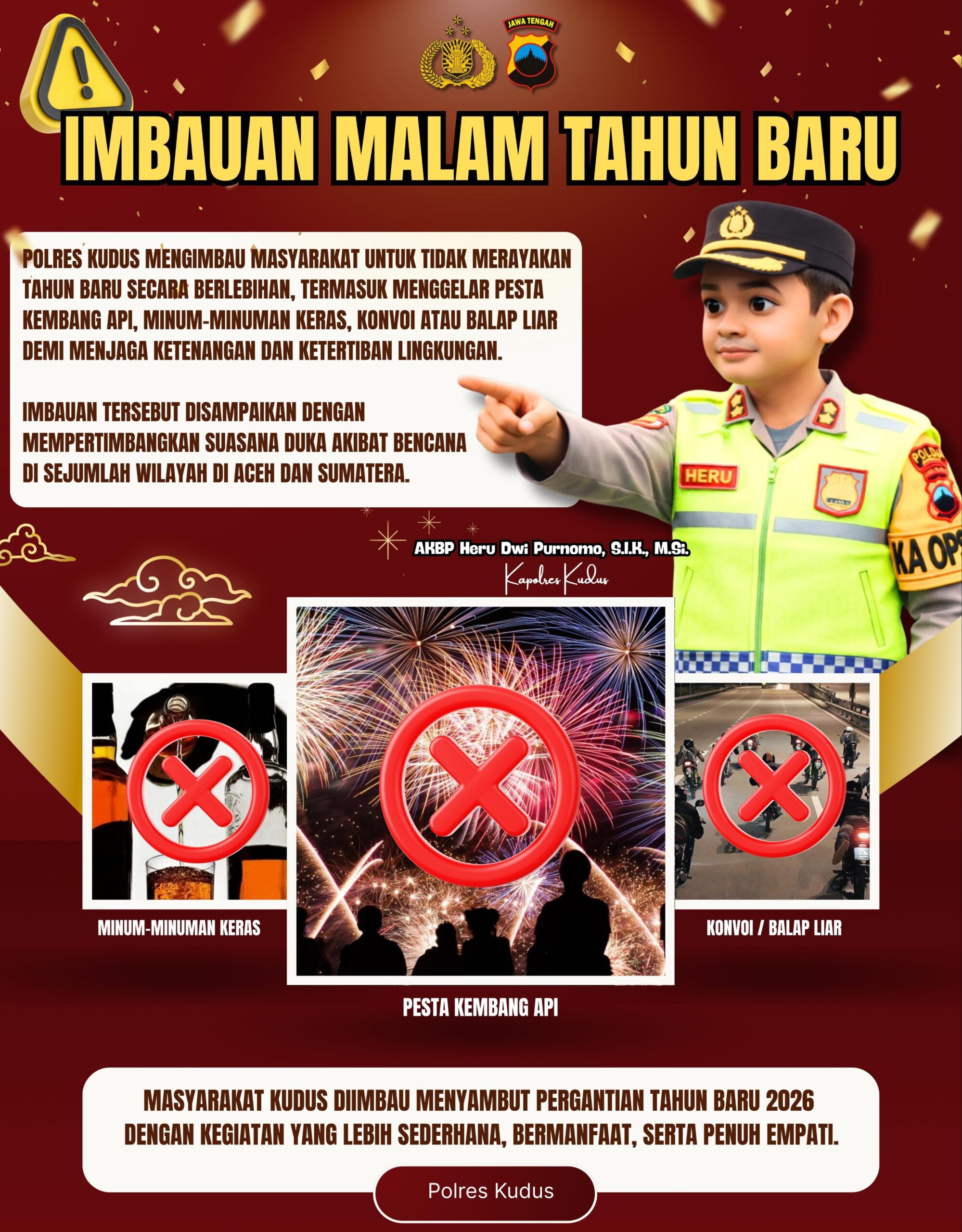 AKBP Heru juga mengimbau masyarakat Kudus agar tidak merayakan malam tahun baru dengan berlebihan. Sebagai gantinya, masyarakat diajak mengisi malam pergantian tahun dengan kegiatan positif, seperti doa bersama di rumah, lingkungan, maupun tempat ibadah.