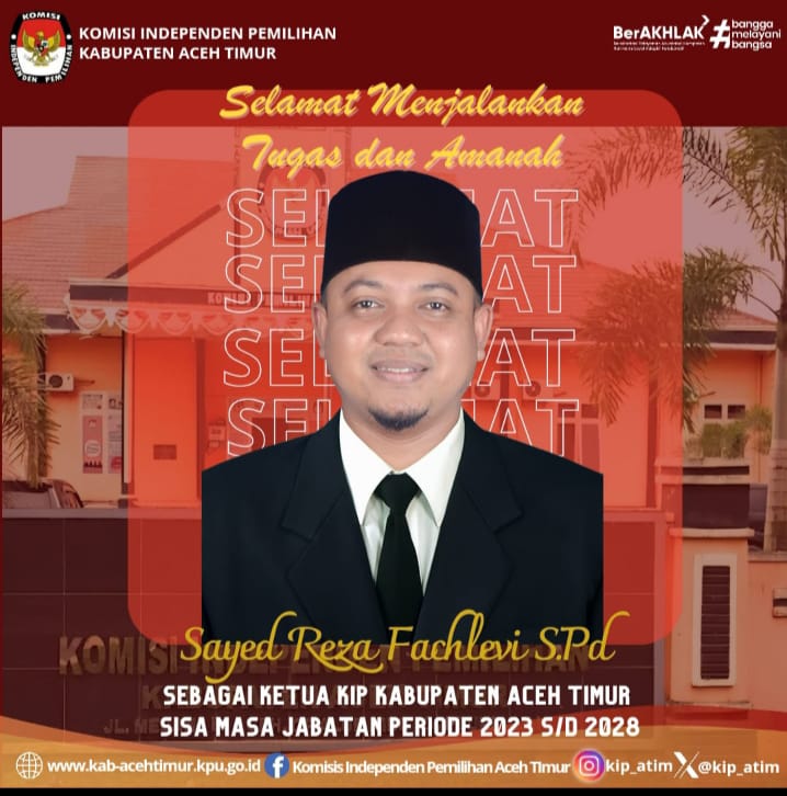 Aceh Timur ( DETIK POST.ID ) – Jabatan Ketua Komisi Independen Pemilihan (KIP) kabupaten Aceh Timur periode 2023-2028 resmi dipegang sayed Reza Fachlevi, S.Pd.