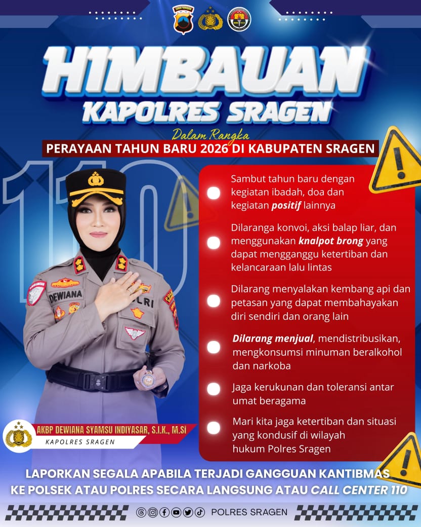 Kabag Ops Polres Sragen Kompol Suyono, mewakili Kapolres Sragen AKBP Dewiana Syamsu Indyasari, menyampaikan bahwa larangan tersebut dituangkan dalam imbauan resmi kepada seluruh masyarakat agar menyambut malam Tahun Baru secara sederhana, tertib, dan bermakna.