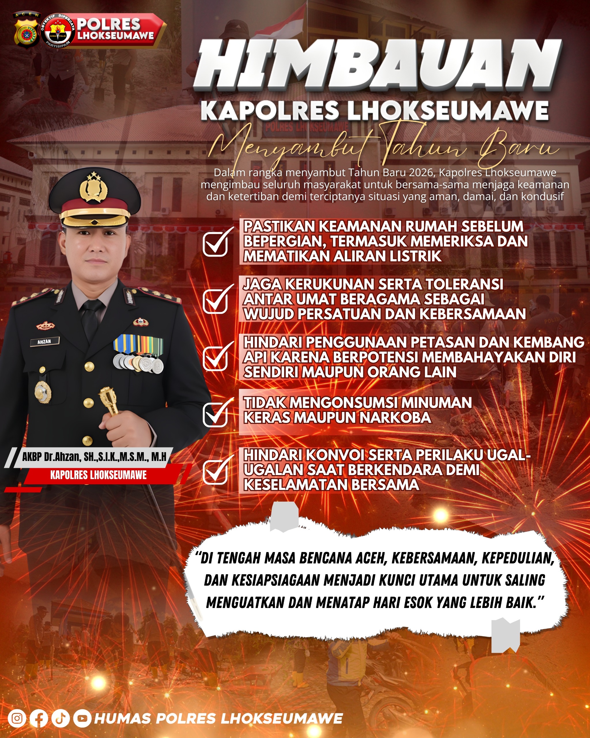 Mari kita sambut Tahun Baru 2026 dengan semangat kebersamaan dan kepedulian. Bersama-sama, kita jaga keamanan dan ketertiban agar situasi tetap kondusif,” pungkas Kapolres Lhokseumawe.