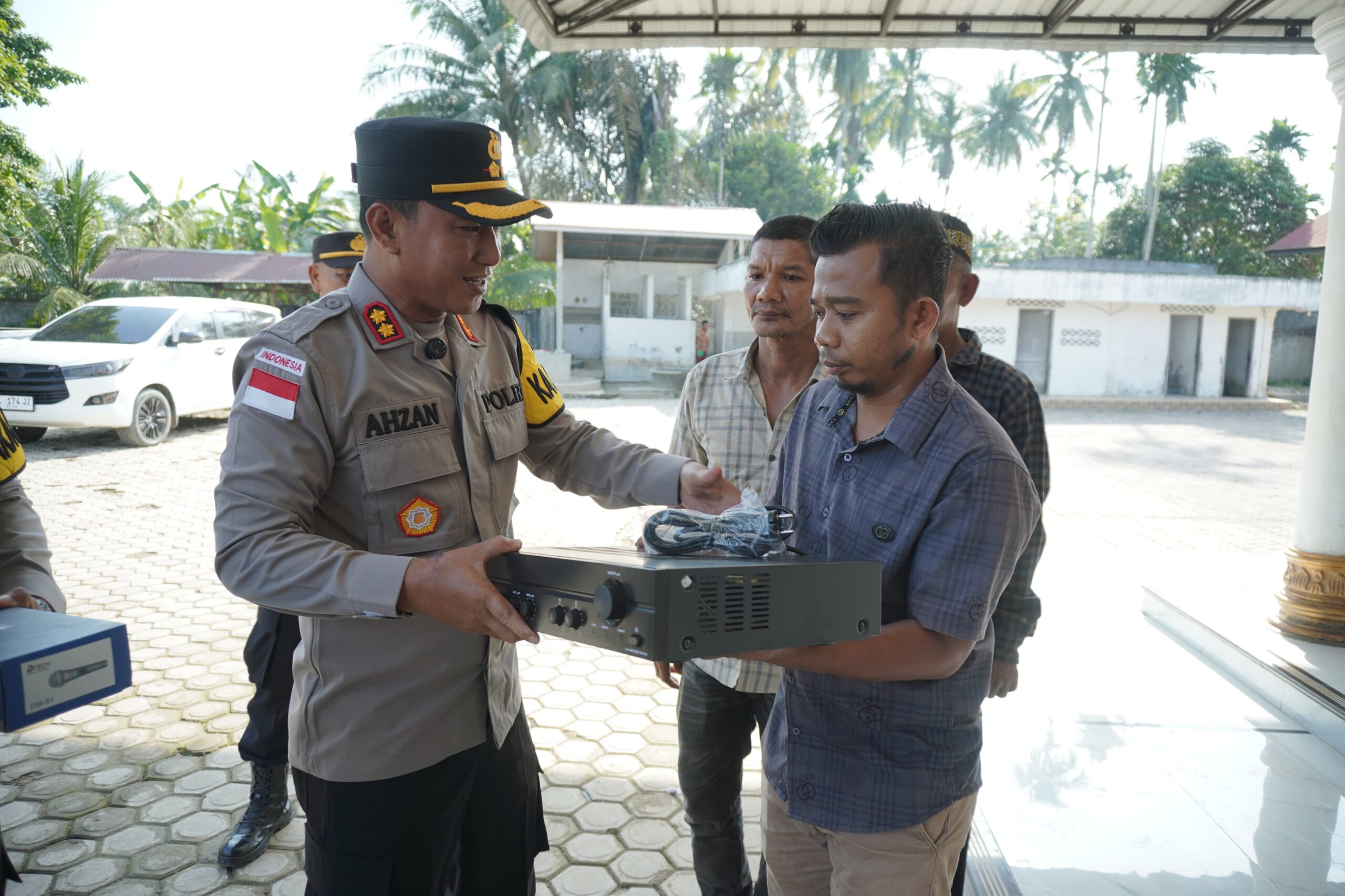 Waktu kami melaksanakan pembersihan masjid, kami melihat peralatan ampli di sini masih meminjam. Padahal ampli sangat penting untuk menunjang ibadah. Karena itu, kami berupaya membantu menyediakan yang baru. Alhamdulillah, setelah diuji, kualitasnya bagus dan sudah bisa langsung digunakan,” jelas Kapolres.