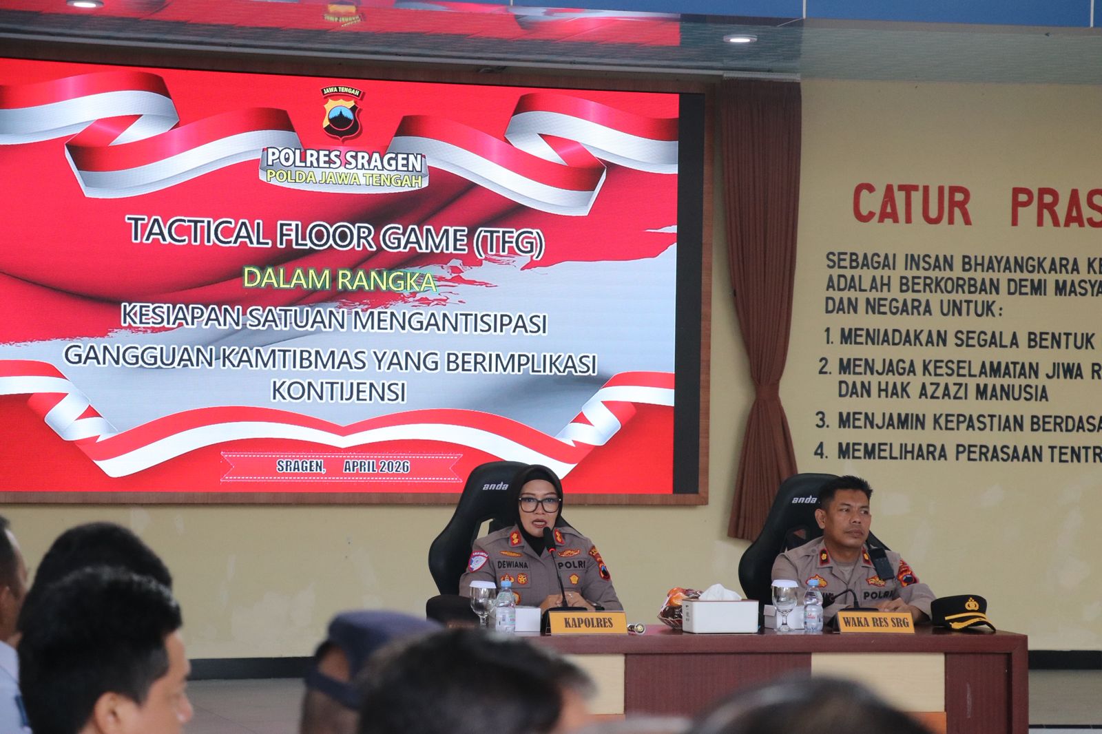 Kapolres Sragen, AKBP Dewiana Syamsu Indyasari, memimpin langsung kegiatan Tactical Floor Game (TFG) di Hall Sibhara Mapolres Sragen, Selasa (21/4/2026), sebagai langkah antisipatif menghadapi potensi dinamika di lapangan.