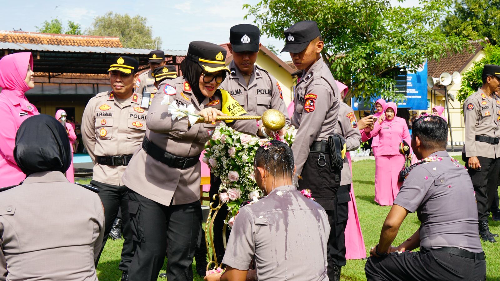 Tradisi penyiraman air kembang secara simbolis turut dilakukan oleh Kapolres kepada perwakilan personel, yang dimaknai sebagai simbol penyucian diri, penyegaran semangat, serta harapan agar para personel senantiasa membawa kebaikan dan keteladanan dalam setiap pelaksanaan tugas.