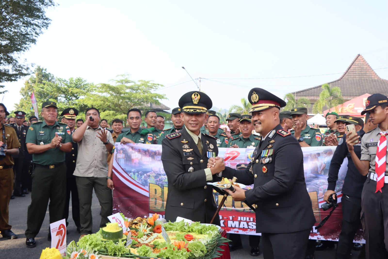 Rombongan anggota Kodim 0728/Wonogiri yang dipimpin langsung oleh Dandim Letkol Inf Edy Rsitriyono, S.Pd., M.I.P., datang membawa kue ulang tahun dan karangan bunga ucapan selamat HUT Bhayangkara ke-79. Kedatangan rombongan TNI ini disambut hangat oleh Kapolres Wonogiri AKBP Jarot Sungkowo, S.H., S.I.K., M.H., beserta jajaran.