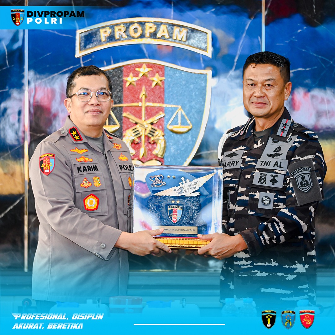 Jakarta – Divisi Profesi dan Pengamanan (Divpropam) Polri menerima kunjungan silaturahmi dari Komandan Pusat Polisi Militer Angkatan Laut (Danpuspomal) Mayjen TNI (Mar) Harry Indarto, S.E., M.M. beserta rombongan, dalam suasana penuh keakraban dan kebersamaan.