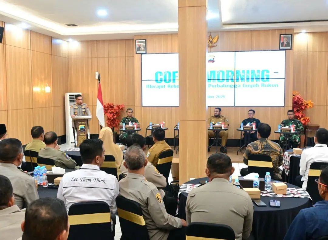 Kapolres Purbalingga AKBP Achmad Akbar, S.I.K., M. Si., menyampaikan kegiatan voffee morning ini bertujuan untuk mempererat sinergitas, komunikasi, serta koordinasi antara pemerintah daerah, TNI, Polri, dan masyarakat dalam mendukung pembangunan serta menjaga stabilitas keamanan di wilayah Kabupaten Purbalingga.