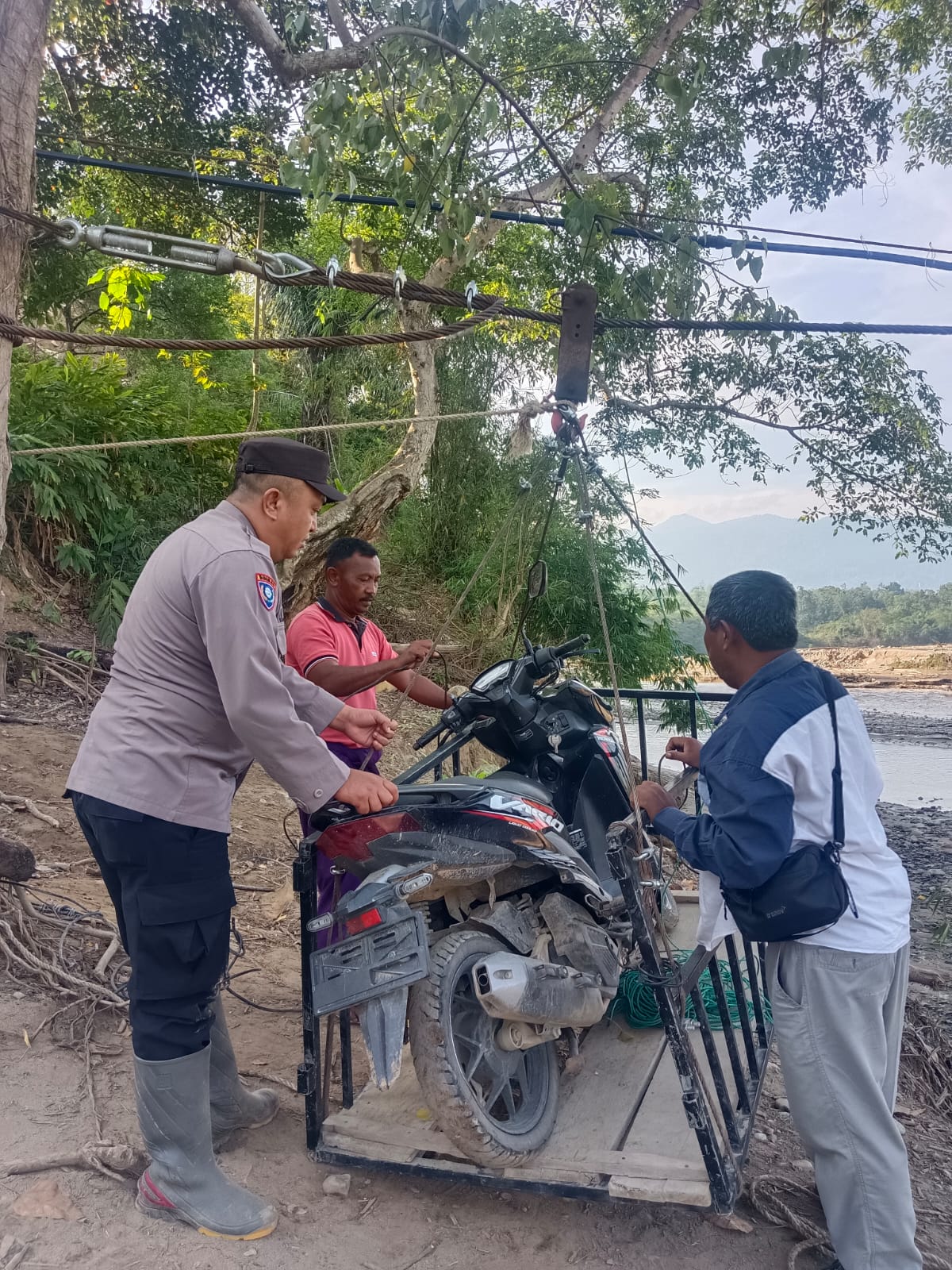 Dengan menggunakan tali sling sebagai alat bantu, personel bersama warga bahu-membahu mengamankan proses penyeberangan, termasuk kendaraan roda dua, guna memastikan keselamatan masyarakat saat melintas di jalur tersebut.