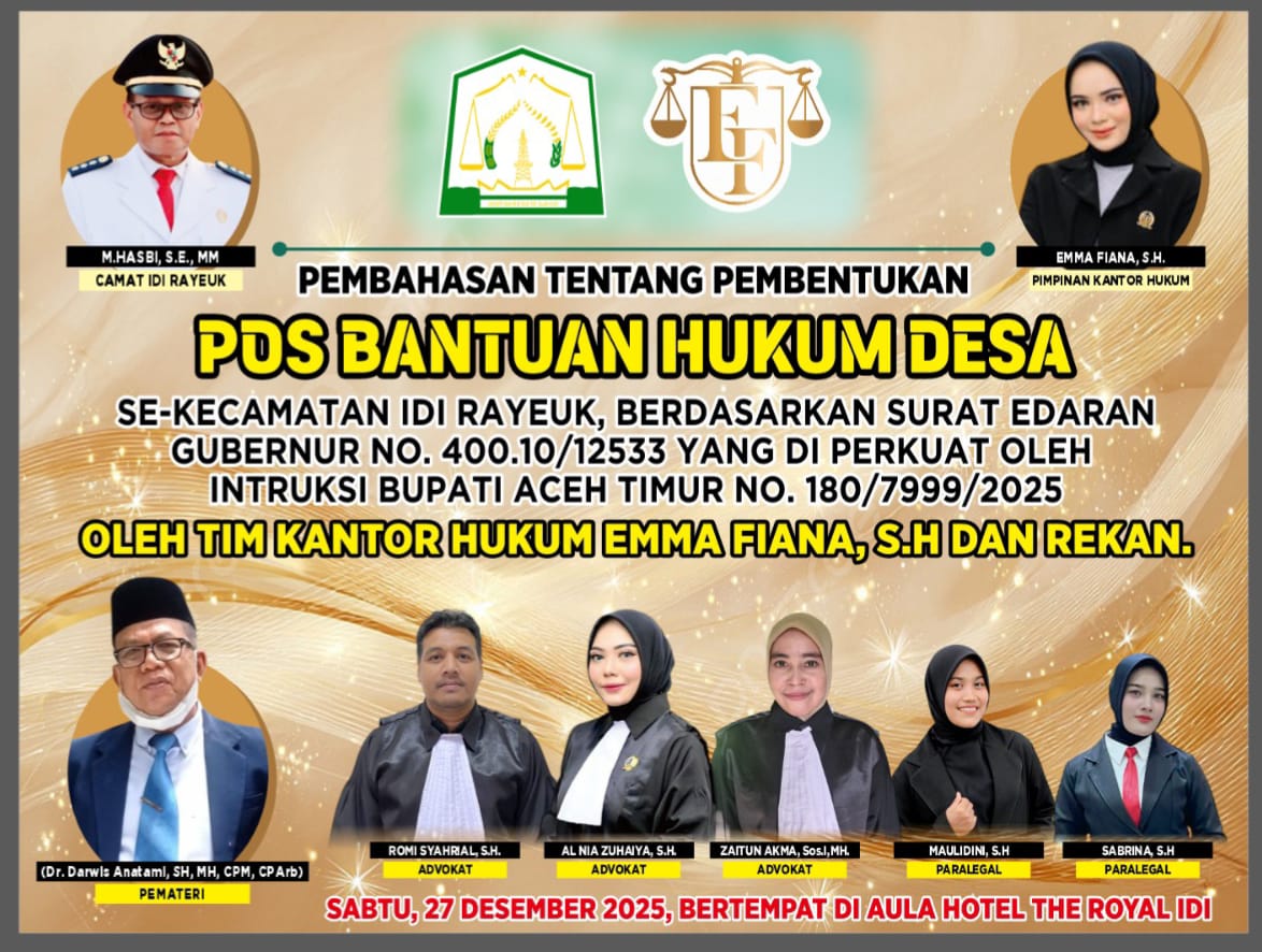 Aceh Timur ( DETIK POST.ID ) — Pimpinan Kantor Hukum Emma Fiana dan Rekan menggelar sosialisasi pembentukan Pos Bantuan Hukum (Posbankum) bagi desa/kelurahan di Kecamatan Idi Rayeuk. Kegiatan ini dilaksanakan berdasarkan Surat Edaran Gubernur Aceh Nomor 400.10/12533 yang diperkuat dengan Surat Edaran Bupati Aceh Timur Nomor 180/7999/2025.