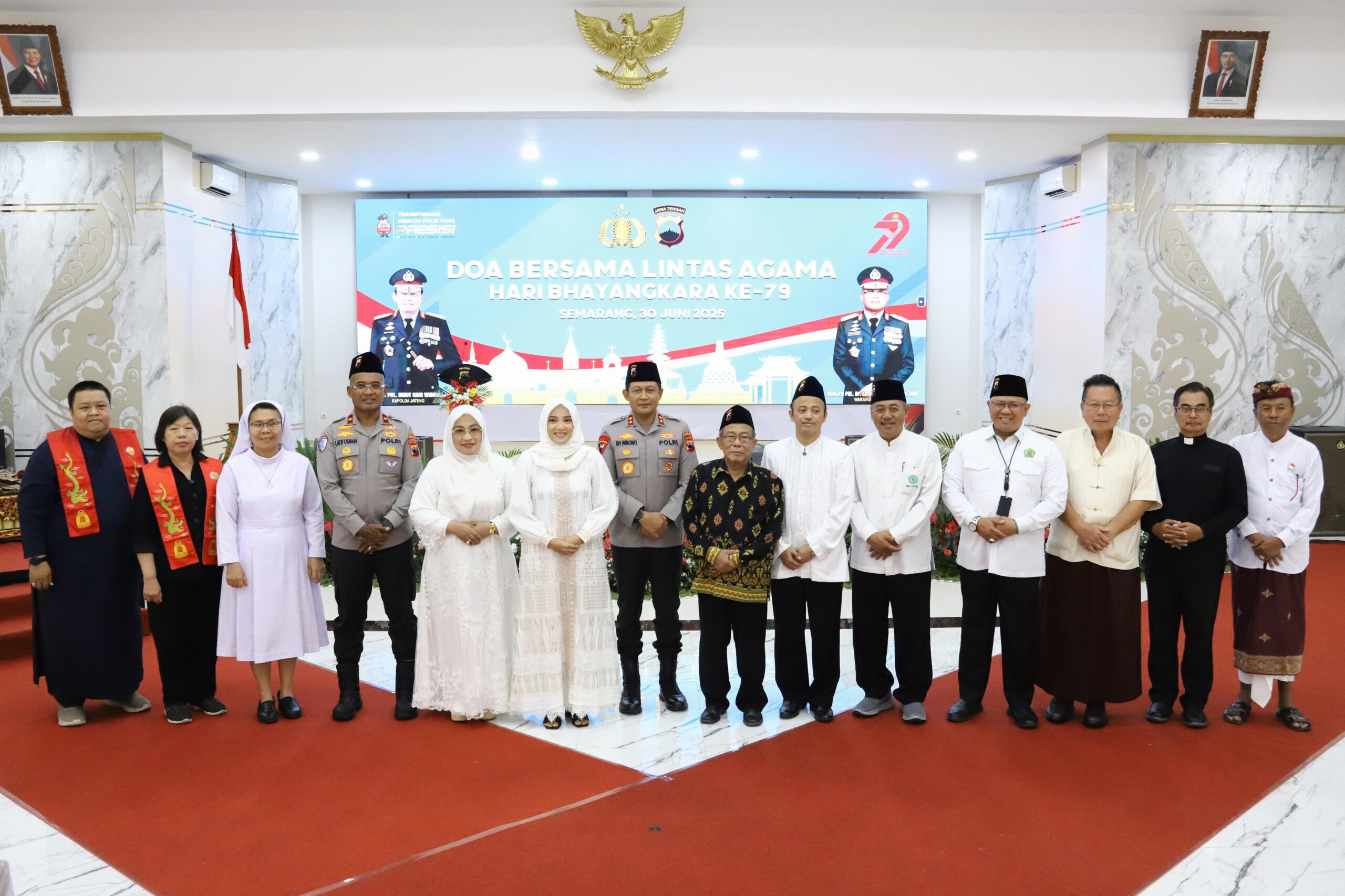 Semarang-Polda Jateng | Dalam rangka memperingati Hari Bhayangkara ke-79, Polda Jateng menggelar kegiatan Doa Bersama Lintas Agama yang berlangsung khidmat dan penuh semangat kebersamaan pada hari Senin, (30/6/2025) pagi di Gedung Borobudur Mapolda Jateng. Kegiatan ini menjadi momen reflektif sekaligus simbol harmoni antarumat beragama dalam mendukung peran Polri sebagai pelindung, pengayom, dan pelayan masyarakat.