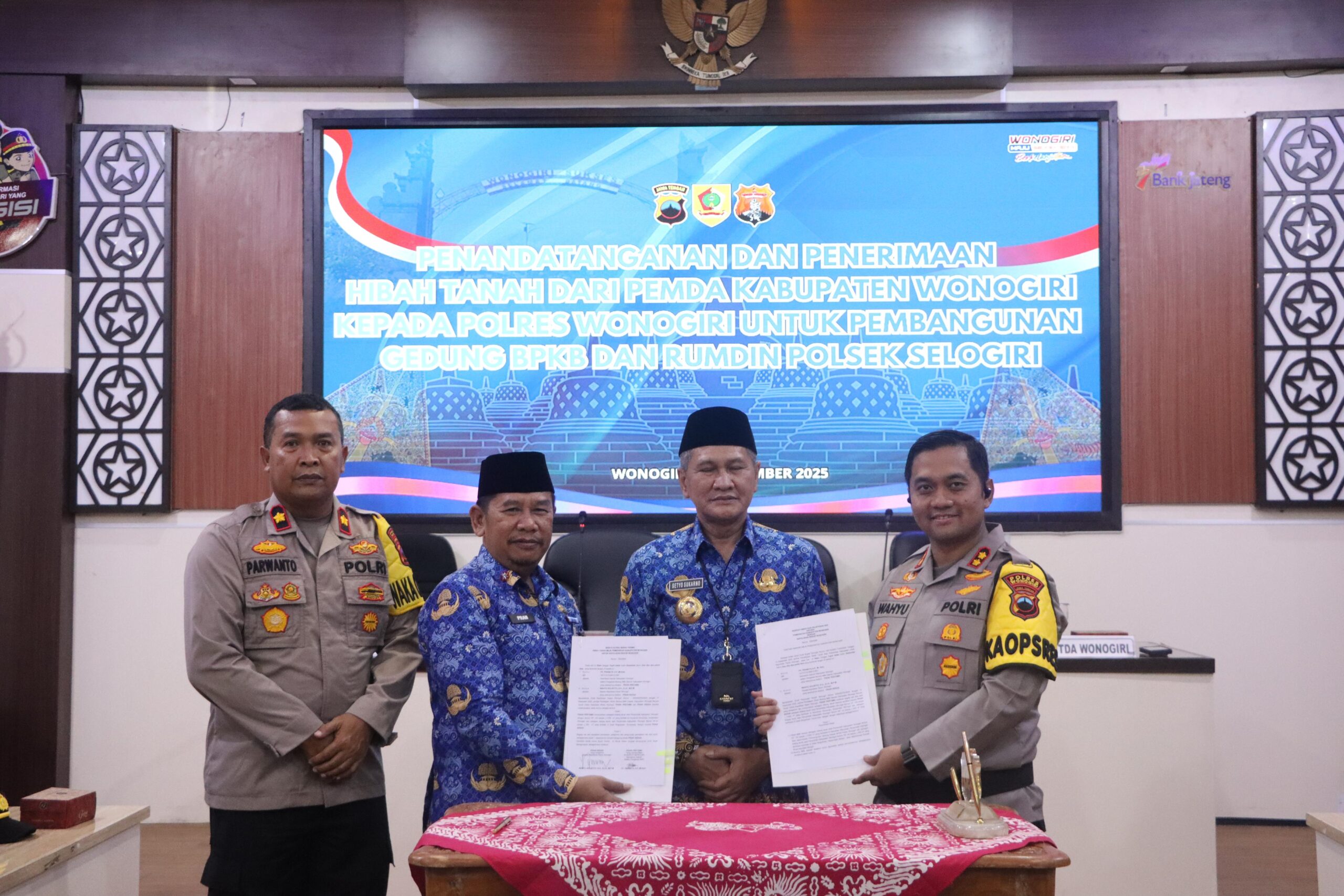 Wonogiri – Polres Wonogiri menerima hibah tanah dari Pemerintah Kabupaten Wonogiri untuk pembangunan Gedung Satpas BPKB Polres Wonogiri dan rumah dinas Polsek Selogiri. Penandatanganan dan penyerahan hibah tanah tersebut dilaksanakan di Aula Sanika Satya Wada Polres Wonogiri, Jumat (19/12/2025).