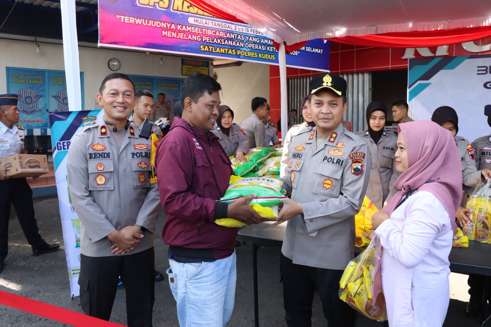 Kudus – Menjelang Hari Raya Idul Fitri 1447 Hijriah, Polres Kudus menggelar kegiatan Gerakan Pangan Murah untuk membantu masyarakat mendapatkan kebutuhan pokok dengan harga terjangkau yang berlangsung di depan Pos Patwal Simpang Tujuh Kota Kudus, Jumat (13/3/2026) pagi.