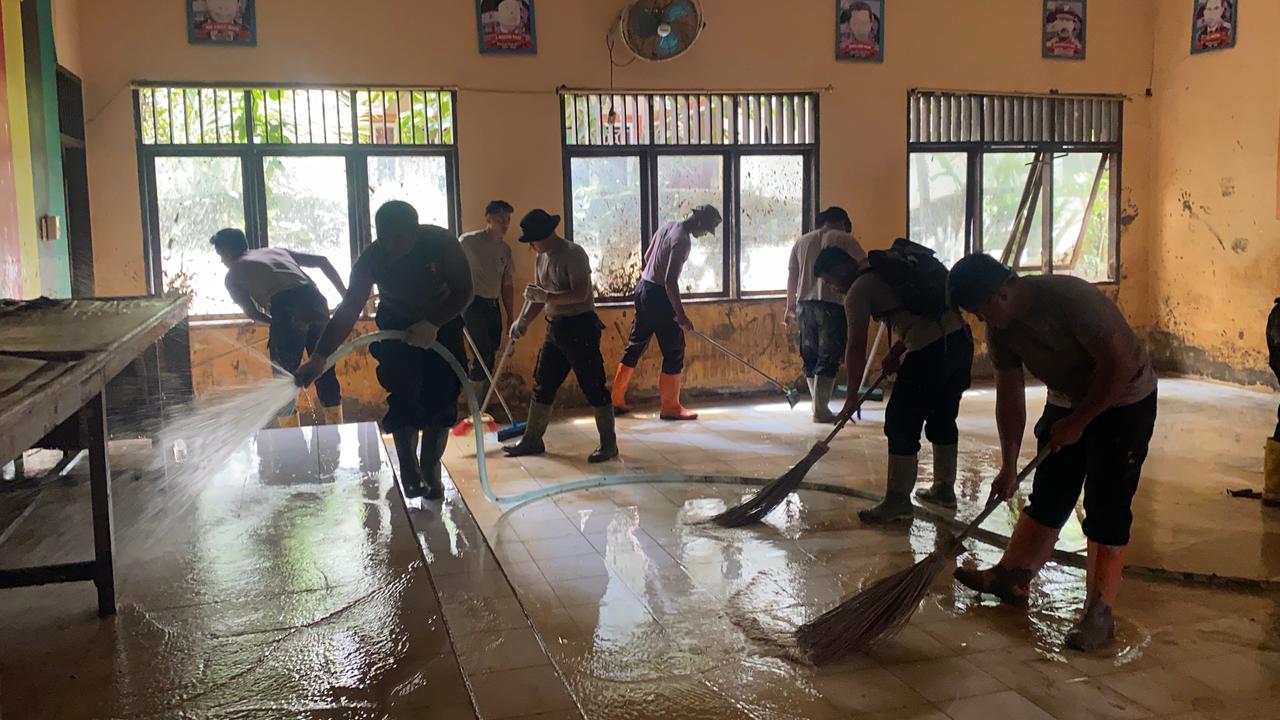 Personel Polri bersama warga tampak membersihkan lumpur dan material sisa banjir, menyedot genangan air menggunakan mesin pompa, melakukan pengecatan ulang, serta menata kembali fasilitas pendukung agar kantor tersebut dapat kembali difungsikan untuk kegiatan pendidikan dan pembinaan guru.