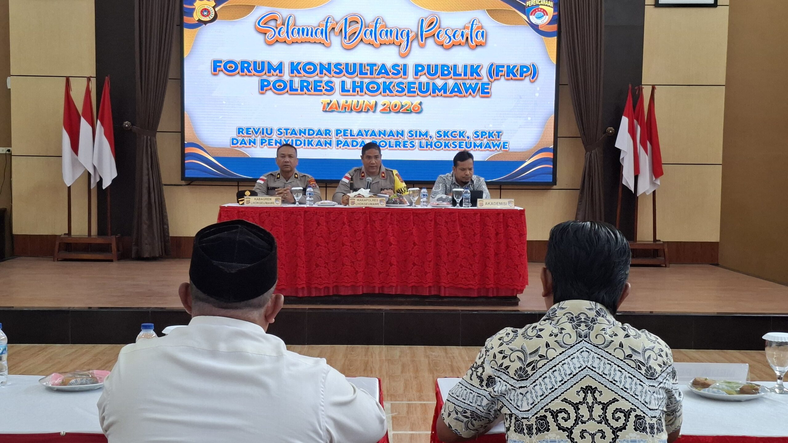 Lhokseumawe ( DETIK PIST.ID ) – Polres Lhokseumawe menggelar Forum Konsultasi Publik (FKP) Tahun 2026 di Gedung Serbaguna Wira Satya Mapolres Lhokseumawe, Jumat (13/2/2026) pagi. Kegiatan ini menjadi wadah dialog terbuka antara Polri dan masyarakat dalam rangka meningkatkan kualitas pelayanan publik di wilayah hukum Polres Lhokseumawe.