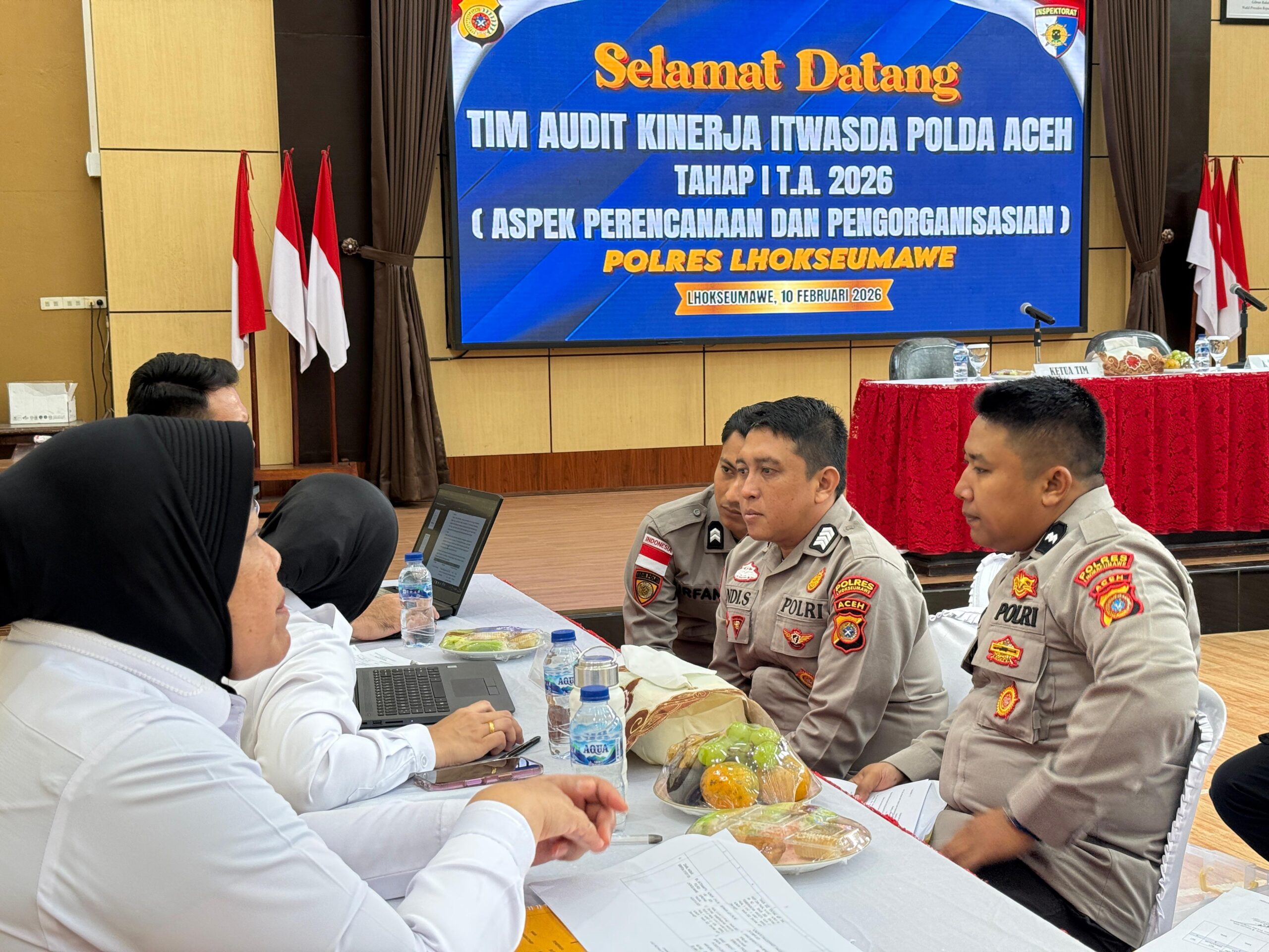 LHOKSEUMAWE ( DETIK POST.ID ) – Polres Lhokseumawe menerima pelaksanaan Audit Kinerja Tahap I Tahun Anggaran 2026 dari Inspektorat Pengawasan Daerah (Itwasda) Polda Aceh dengan fokus pada aspek perencanaan dan pengorganisasian. Kegiatan audit tersebut berlangsung di Aula Serbaguna Polres Lhokseumawe, Selasa (10/2/2026).