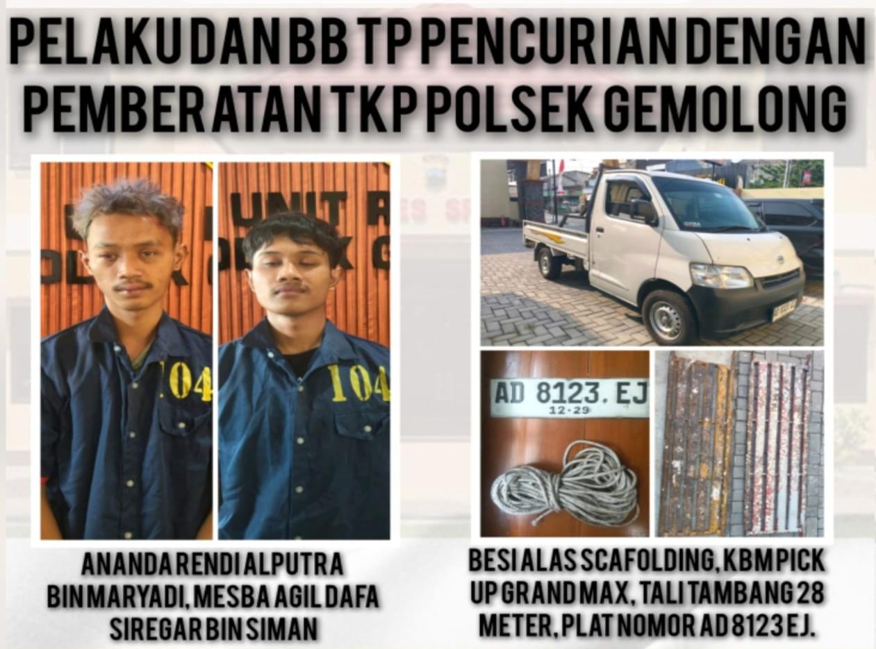 Sejumlah barang bukti (BB) yang berhasil disita antara lain satu Unit KBM Pick Up Grand Max (ditinggalkan di TKP Gemolong), satu Unit KBM Pick Up L300, 1 Unit KBM Pick Up Grand Max AD, puluhan set besi skafolding/steger (alas dan tiang), uang tunai hasil kejahatan sebesar Rp 100.000, alat kejahatan berupa tali tambang dan plat nomor palsu.