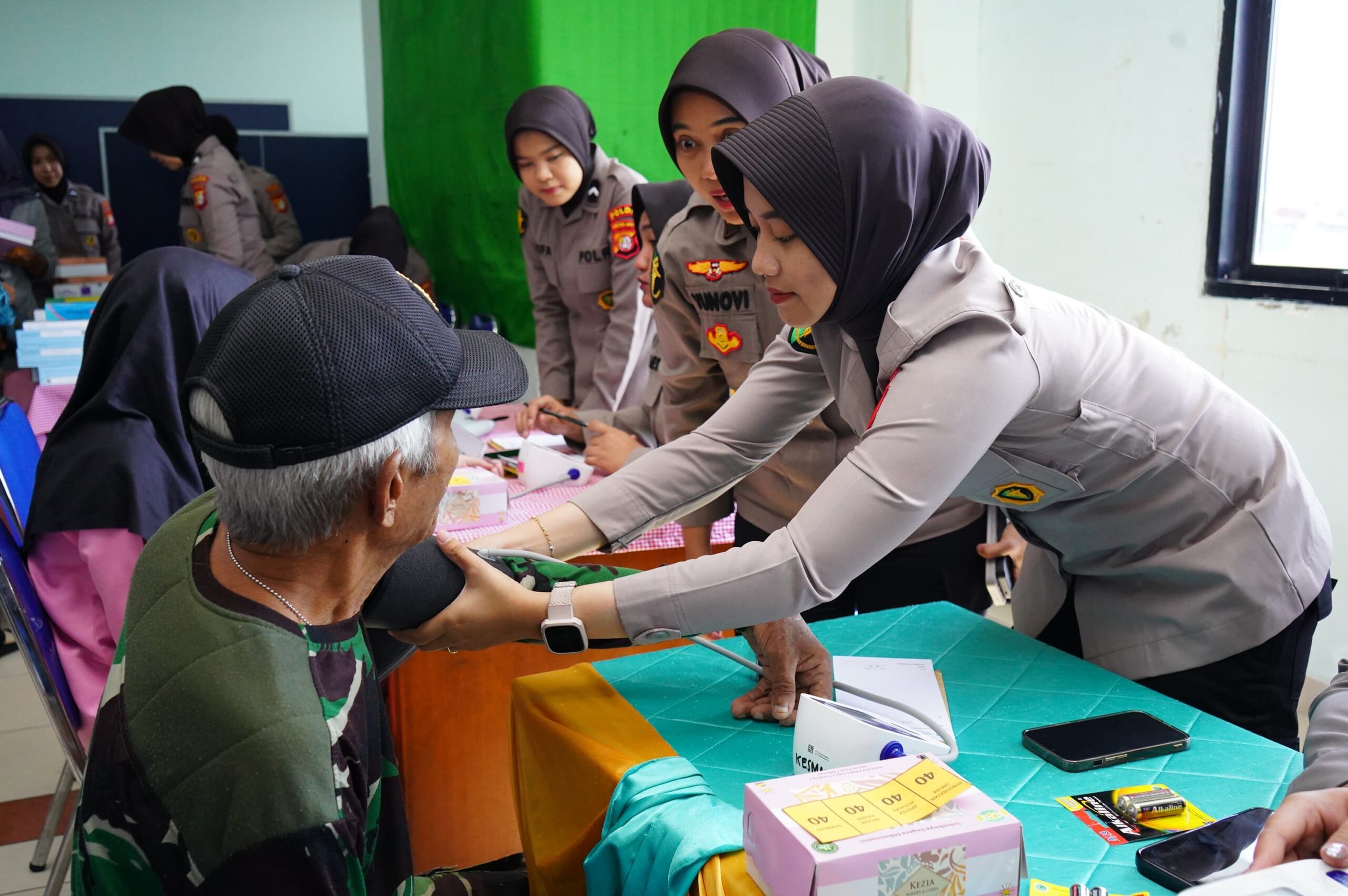 Sebagai wujud kepedulian, Polwan menggelar bakti kesehatan gratis yang meliputi pemeriksaan tensi darah, cek laboratorium sederhana, serta konsultasi kesehatan bersama dokter Biddokkes Polda Metro Jaya.