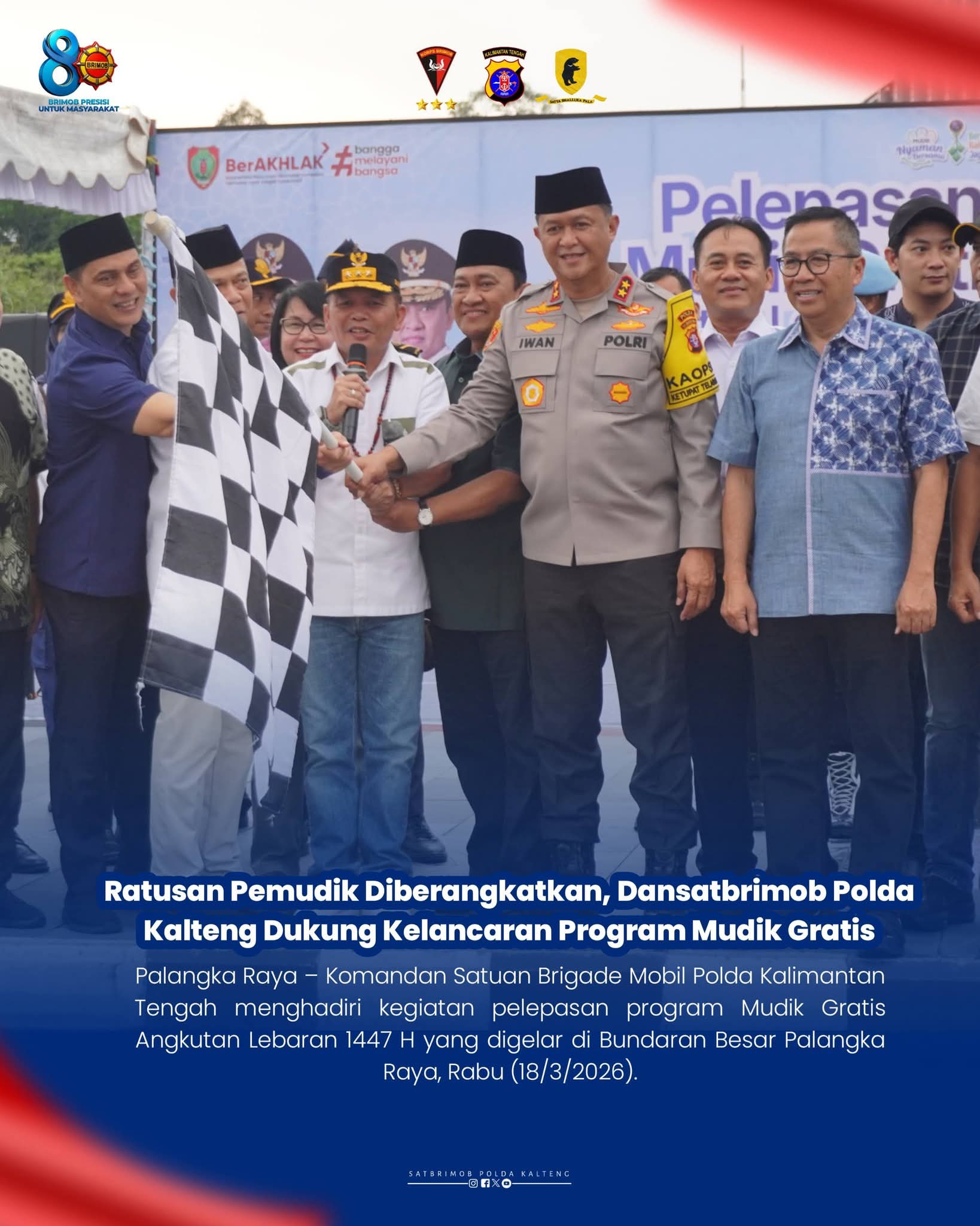 Palangka Raya, Detikpost.id – Komandan Satuan Brigade Mobil Polda Kalimantan Tengah menghadiri kegiatan pelepasan program Mudik Gratis Angkutan Lebaran 1447 H yang digelar di Bundaran Besar Palangka Raya, Rabu (18/3/2026).