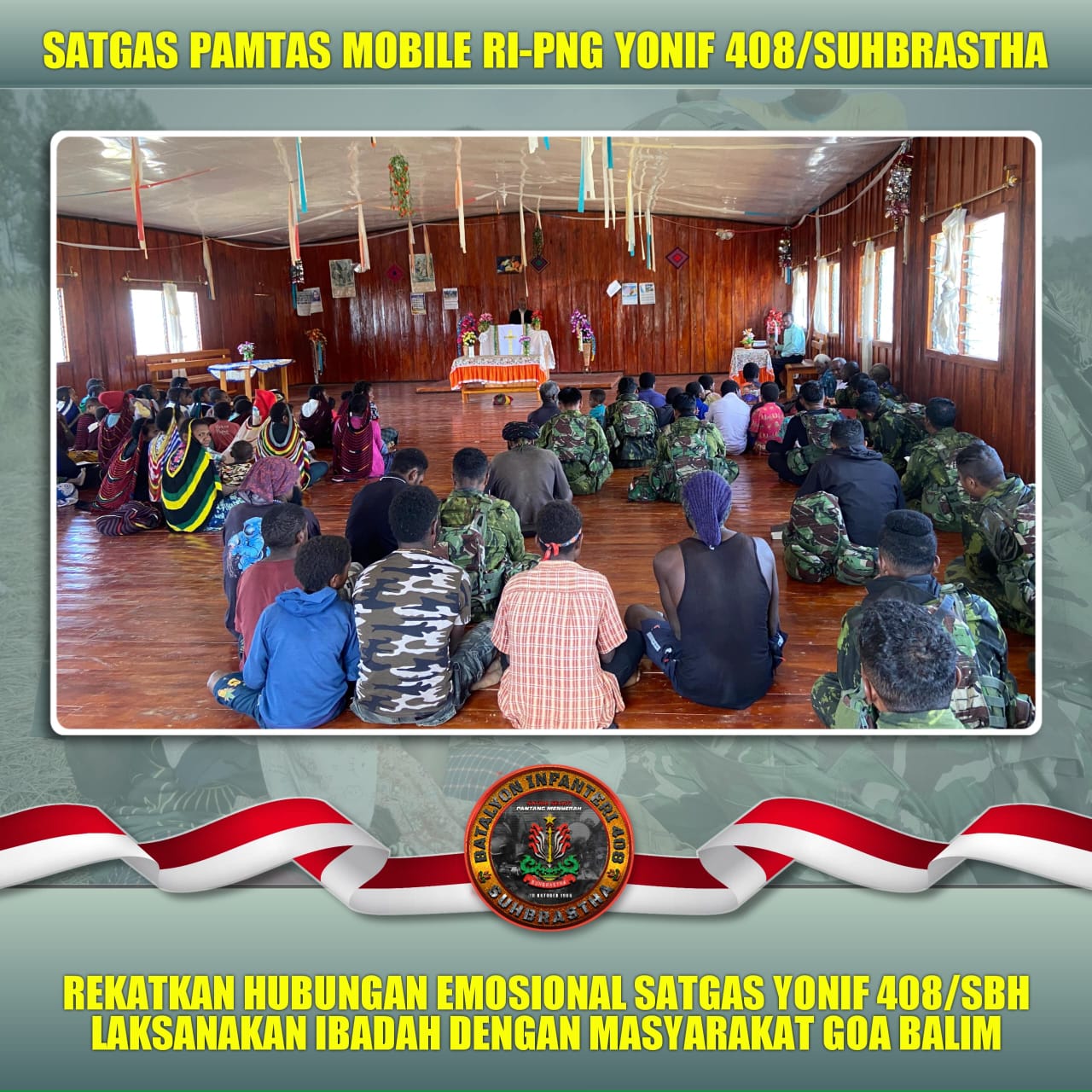 Warga dan Prajurit TNI bersalaman satu sama lain dengan senyum hangat suasana Gereja penuh kedamaian “Kebersamaan dalam Doa, senyum dan rasa persaudaraan hari ini menjadi bukti Satgas Yonif 408/Sbh Pos Wamitu hadir untuk masyarakat dengan hati yang tulus,bersama membangun Papua yang aman dan damai.