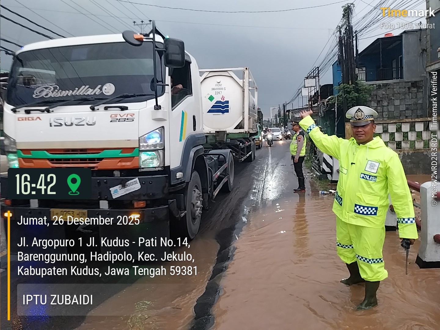 Kudus – Satlantas Polres Kudus bersama Polsek Jekulo melakukan pengaturan arus lalu lintas di Jalan Raya Kudus – Pati yang tergenang banjir akibat luapan Sungai Jati Pasean, Desa Hadipolo, Kecamatan Jekulo, Kudus pada Jumat (26/12/2025) sore.