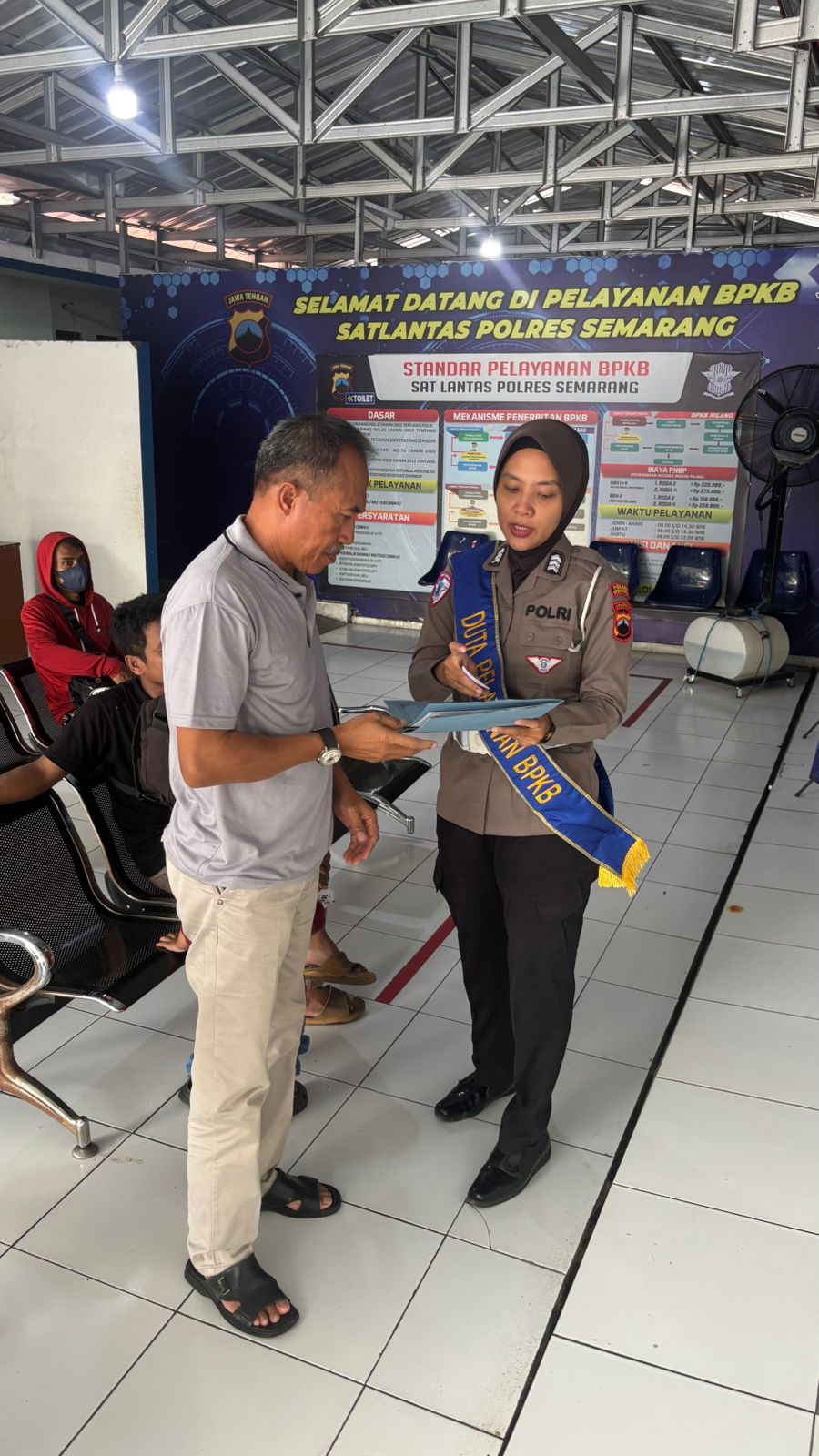 Semarang – Satlantas Polres Semarang terus meningkatkan kualitas pelayanan publik dengan memberikan informasi langsung kepada wajib pajak terkait prosedur ganti alamat kendaraan bermotor di Samsat Semarang, Jumat (19/12/2025).
