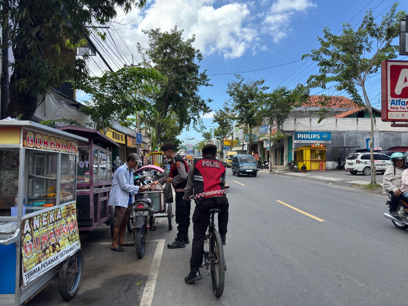 Patroli bersepeda kali ini, juga dibarengi dengan program “Jumat Berkah”. Di sela-sela pemantauan wilayah, para personel Satsamapta membagikan paket makanan siap saji kepada para abang becak dan warga kurang mampu yang ditemui di sepanjang rute patroli.