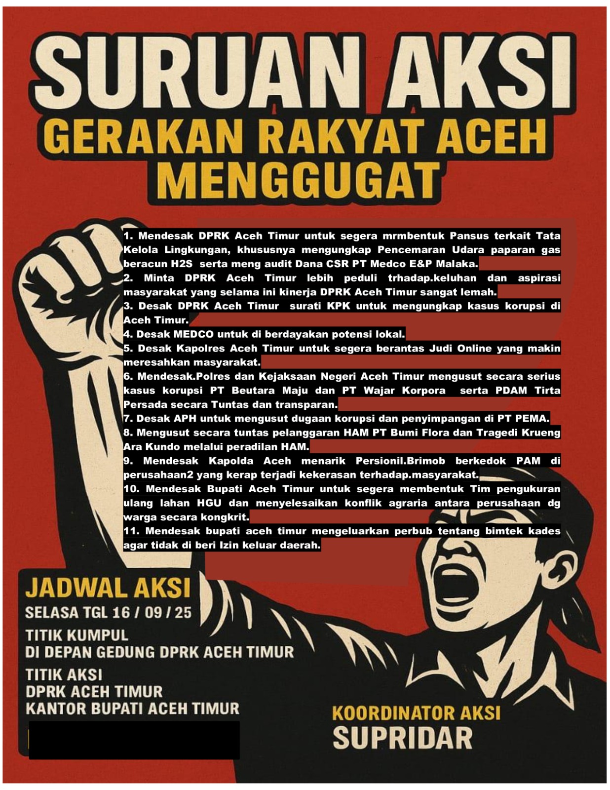 ACEH TIMUR ( DETIK POST.ID ) – Massa aksi yang menamakan dirinya Gerakan aceh menggugat,bakal menggelar aksi demonstrasi di depan kantor DPRK, kantor bupati Aceh Timur, Selasa 16/9/2025, menuntut penegak hukum mengusut tuntas kasus korupsi , CRS PT MEDCO, dan upaya menghambur – hamburkan milyaran dana desa di luar daerah dan menghentikan kegiatan study tour aparat desa di setiap tahun ke luar daerah.