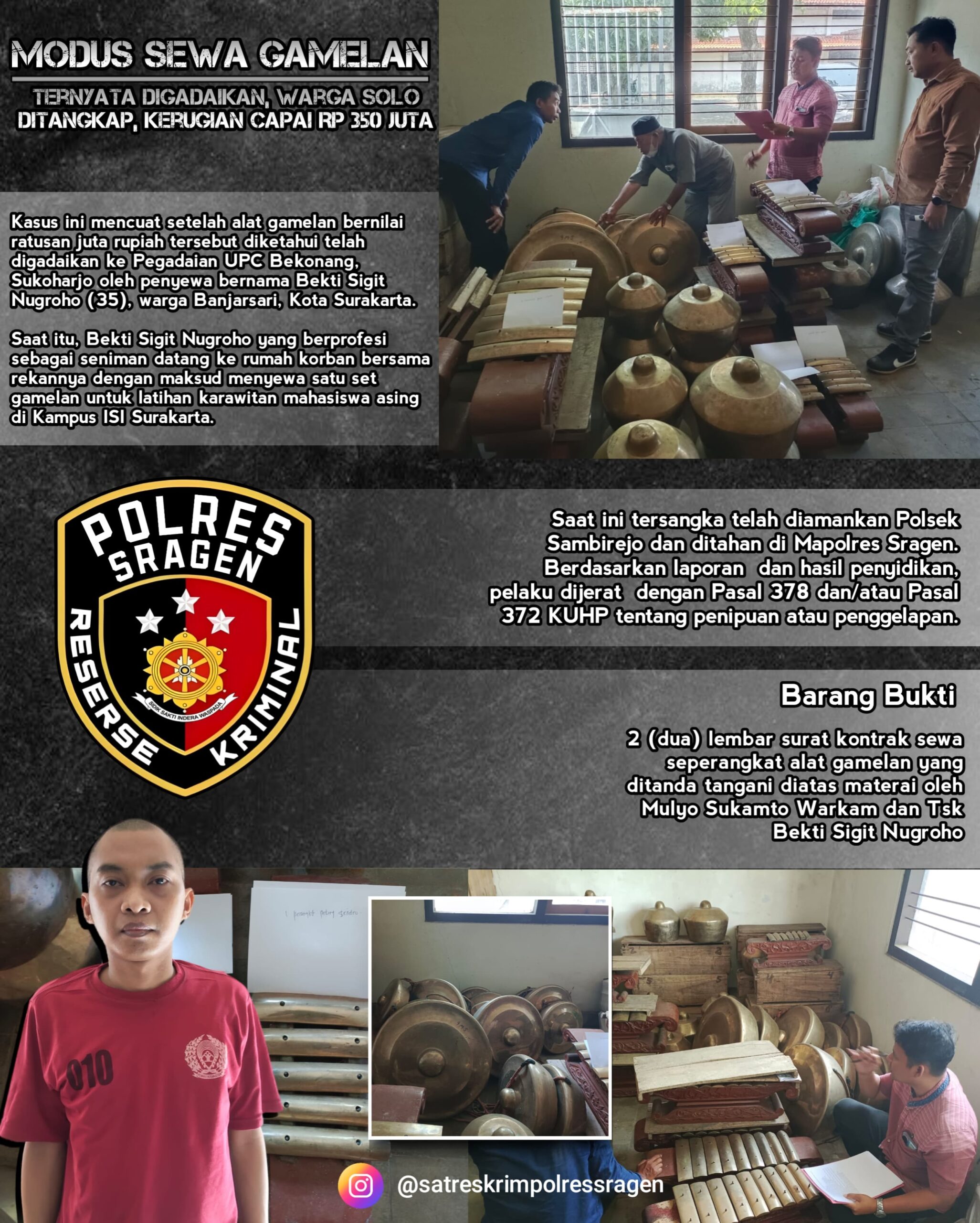“Saat ini, penyidik telah memeriksa saksi-saksi, termasuk pihak keluarga korban dan rekan pelaku, serta mengamankan sejumlah barang bukti berupa surat kontrak sewa gamelan yang ditandatangani kedua belah pihak, ” imbuh AKP Ardi.