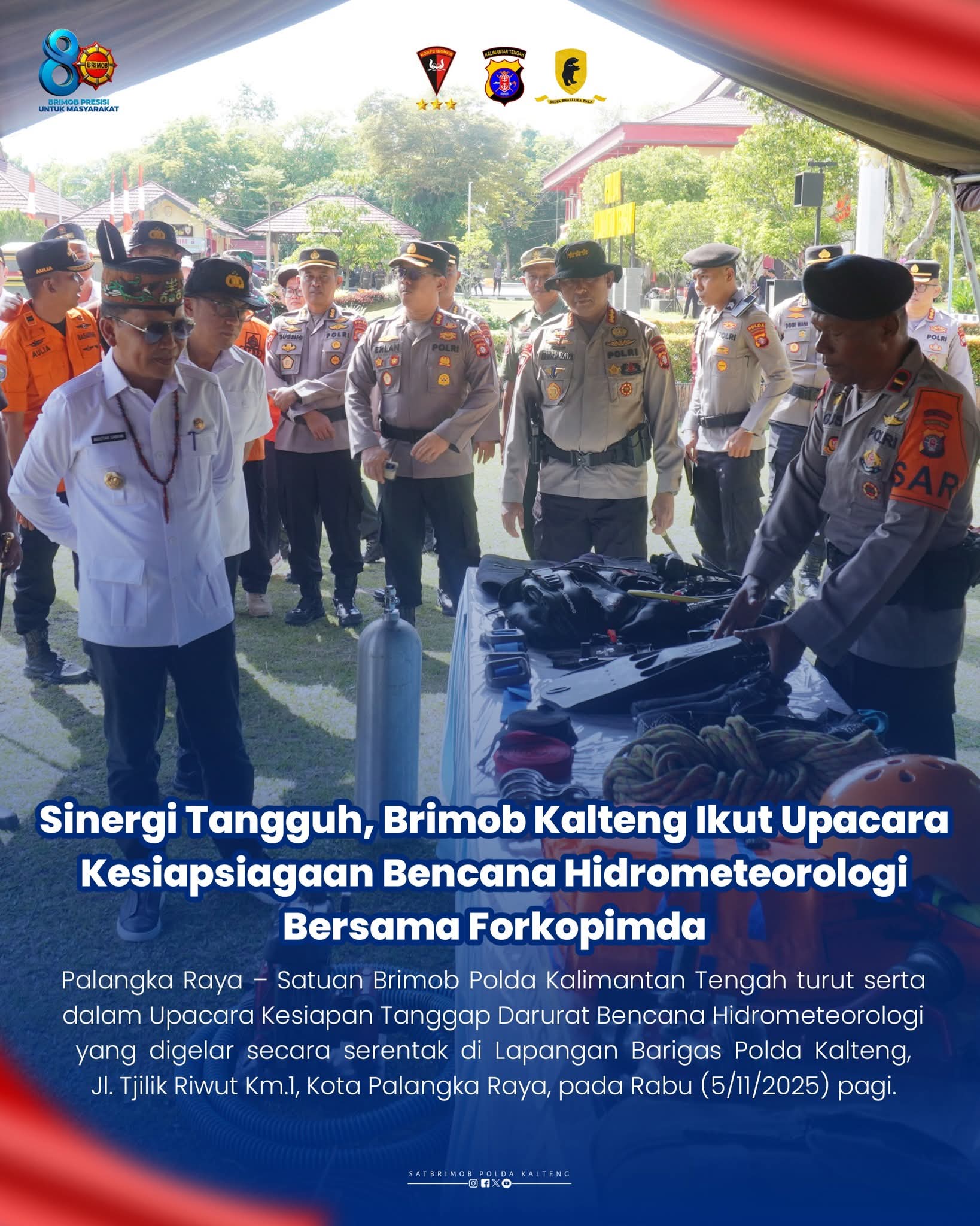 Palangka Raya – Satuan Brimob Polda Kalimantan Tengah turut serta dalam Upacara Kesiapan Tanggap Darurat Bencana Hidrometeorologi yang digelar secara serentak di Lapangan Barigas Polda Kalteng, Jl. Tjilik Riwut Km.1, Kota Palangka Raya, pada Rabu (5/11/2025) pagi.