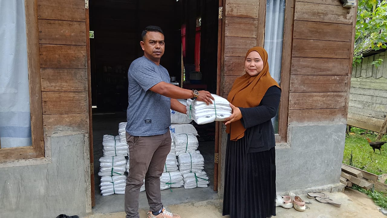 Kepada media ini melalui telepon WhatsApp Junaidi (Ateng) mengatakan”hari ini kami menyalurkan mukena kepada kaum perempuan melalui Joharuddin.