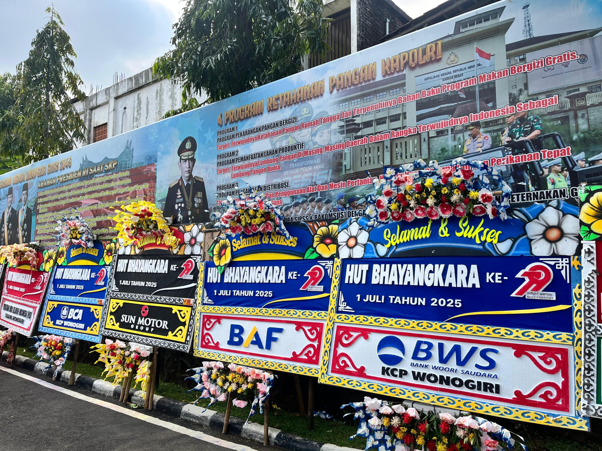Wonogiri – Ratusan Karangan Bunga Ucapan HUT Bhayangkara ke-79 banjiri halaman Polres Wonogiri, Senin (30/6/2025).